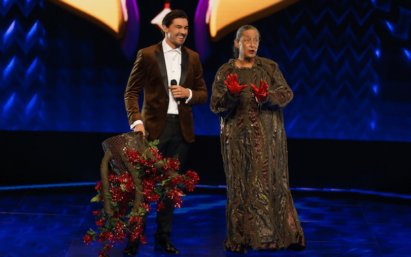It may have been chaos on stage, but the judges were having the time of their lives. The banter flowed and the guesses spewed forth like a volcano spurting out New Zealand celebrities. Anika Moa wondered if Retro Robot was Brian Tamaki, but Jono Pryor pointed out Tamaki was anti-mandate and unlikely to go on a show about masks. Jono reckoned Robot was Rhys Darby, while in the next round, James Roque thought Gladiator Alligator might be Ben Lummis. The jewelled reptile had sauntered onto the stage to sing ‘Moondance’, swivelling his hips like no alligator should. Were we not entertained? The audience certainly were, sending Alligator’s leafy rival Pōhutukawa Tree straight to the bottom three.