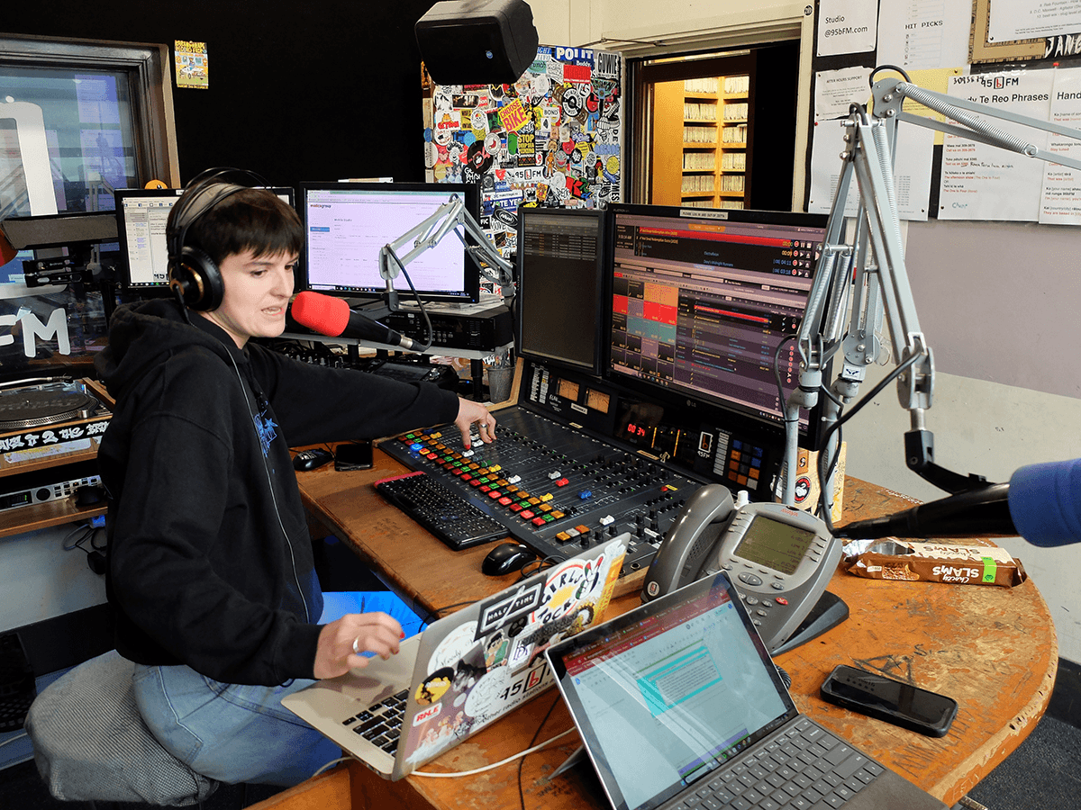 Despite being “old school”, radio is what many turn to in times of disaster. Ashby was a teenager in Christchurch when the earthquakes hit and remembers tuning in to “work out what the hell was going on”. During Covid she found herself on the other side, informing others as news and updates came in. As a news broadcaster, 95bFM was an essential service during lockdowns. The pandemic was “such an intense experience to broadcast through,” she says, “like a fever dream”. Listeners got in touch to say that their bubble consisted only of bFM and their dog. While she was “also just a person feeling anxious,” being able to give people “some stability and some normalcy and some human connection, in a time where there was no stability and no future predictability or anything like that,” felt like a meaningful contribution.