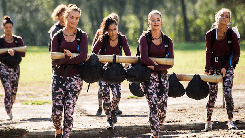 The group date sees all the ladies take part in an awful couples-bonding exercise that is reminiscent of an army boot camp. Well, all take part except Jamie-Lee, who is cockblocked by her moonboot. Each carry with them their relationship issues, quite literally – they’re written on a 15kg backpack, representing their ’emotional baggage’. By traversing mud obstacles and helping each other they overcome their relationship problems, except for the wee nugget that eight women are still vying for the same guy.