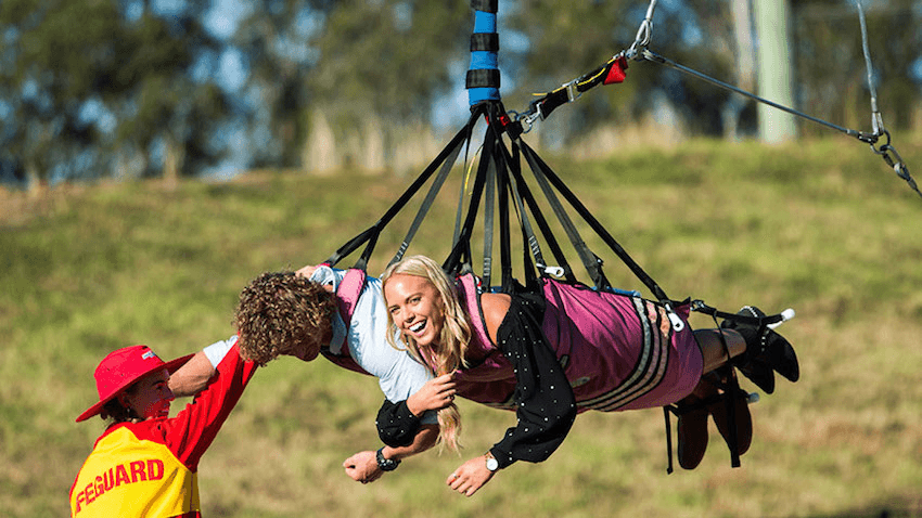 Cassie and Nick first face their fear of heights on the sky-coaster which looks like some tourist crap from Rotorua on crack. Once at the top, Cassie unknowingly pulls the release cord after a sneaky trick from Nick, but she is happy to have faced dying with the one she loves. They wrecking-ball through the sky in a thrill-seeking swoosh, cuddling forcefully the whole time due to the safety pod they are strapped in.