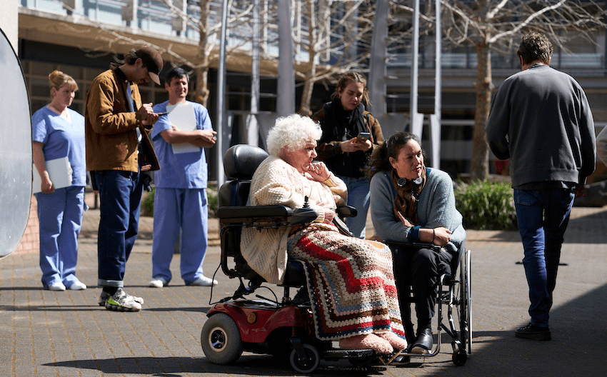 We had wheelchairs all over the set prior to filming and the crew were encouraged to blat around in them, to feel the fear and do it anyway. Visitors to the set had no idea who was actually in chairs and who wasn’t. It felt good to be the majority for a bit.