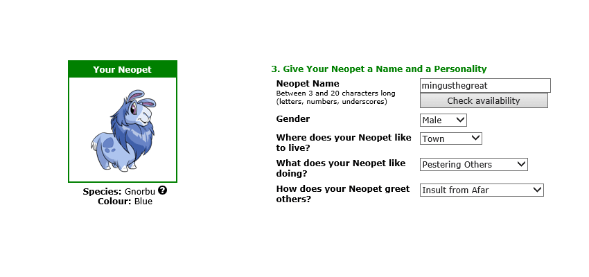 I sign up for a new account just for the sake of it (and because I can’t log into my old one – I lied about my birth year to get onto the forums and now I can’t remember the date) and end up adopting a llama-like Gnorbu. After consulting my work peers on what to call my new plaything, I name him Mingus. He’s rude, annoying, and lives in the city. I soon forget I ever adopted him and neglect to check in on him for about three weeks. I guess Neopets isn’t quite as addictive as I once found it after all.