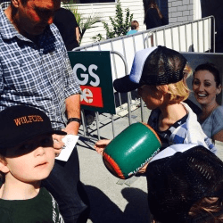 Eventually some volunteers came out and started handing out autograph cards. The kids went wild, screaming, jumping and climbing the barricades to catch a glimpse of them. ‘They’re nobodies’ I screamed at my kids, in an attempt to calm them down. The MoreFM photographer glared at me. Finally the crowds surged – the doors opened and the contestants ran out to work the line. Jo and Damo and Alex and Corban went straight past us and down to the back of the line. My kids lost focus in the scrum and were too small to make it.