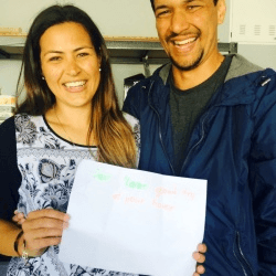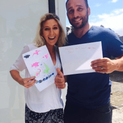 We leave house number three and trot down the driveway to Jo and Damo’s and OMG Jo is in the garden doing some planting. Her and Damo run over to chat and happily pose for a photo holding cards my sons made them (shameless tactics, I know). Damo says they’d love to move to Auckland but can’t afford it. I confidently tell him there’s never been a better time to buy in the Chev. That might not be true.