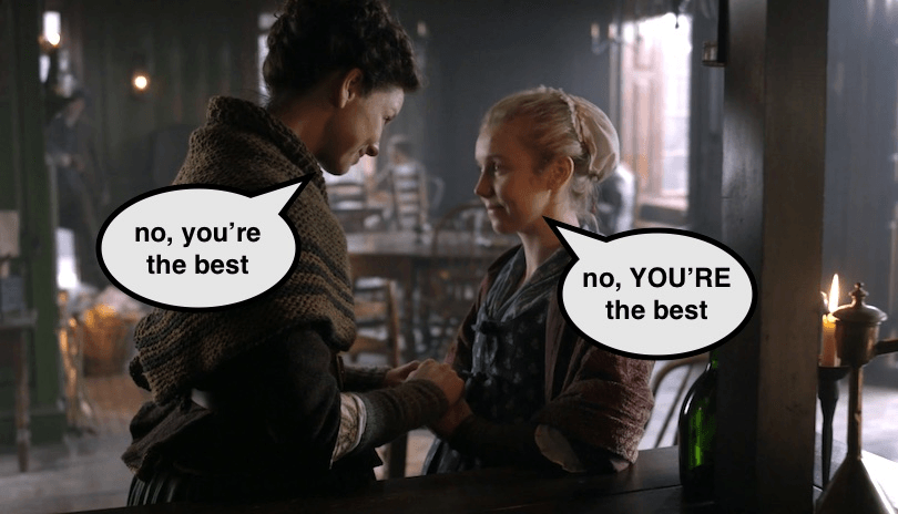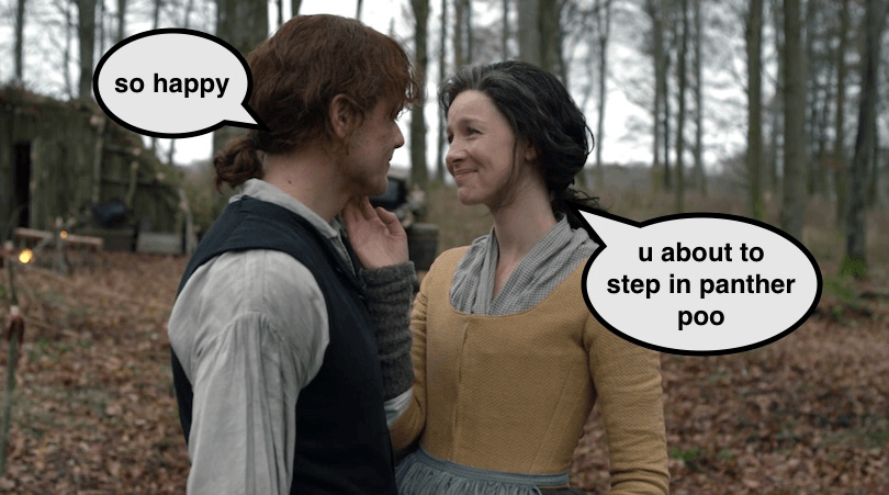 You know who wasn’t courteous? The bear who attacked my new boyfriend John. While Claire held John’s entire abdominal cavity together with her thumb and forefinger, Jamie went to show the bear who was boss. “You’ll get yourself killed!” Claire shouted, and if Jamie and Claire ever renew their vows the ceremony should definitely include “you’ll get yourself killed!” and “I told you to stay here!” and “I let a herd of cows into the prison, just for you!”. Those two, so sweet.