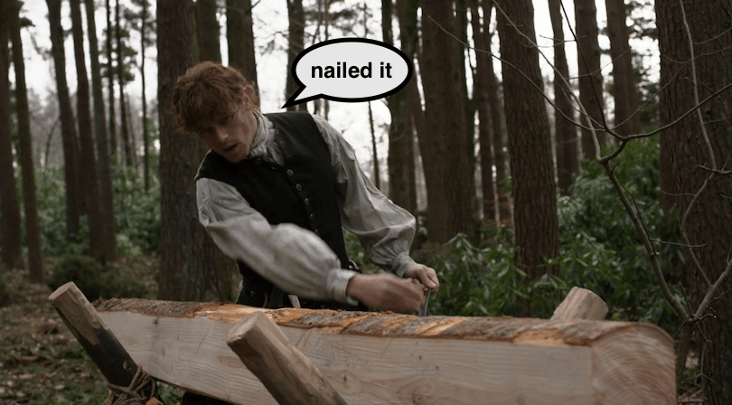 Jamie and Claire began their new life in the mountains, bathing in the golden glow of colonialism. Claire unleashed her inner gun-shooting, fish-gutting self, and had a spring in her step that we’ve not seen since she watched Jamie play shinty at Castle Leoch. She and Jamie began to build their house, so they can spend the rest of their days walking around naked and eating ginger kisses. I’m not a fan of deforestation, but for Jamie Fraser, I make an exception. Much like Pitbull feat. Kesha, it’s going down, I’m yelling timber.