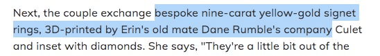 I know, I know. This story could just be the headline and it would probably win an award. This story could just be a tweet and it would get upwards of 10 likes. But, folks, it’s pure hell out there and we need to savour our wins where we can get them. Breathe in, breathe out, and repeat after me. Dane Rumble. 3D Printed. Erin Simpson. And Zac Franich’s. Wedding. Ring. Don’t believe me? Talk to the Woman’s Day article.