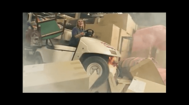 Lily hooning a golf cart through the furniture warehouse and setting everything on fire