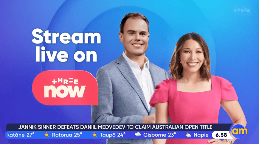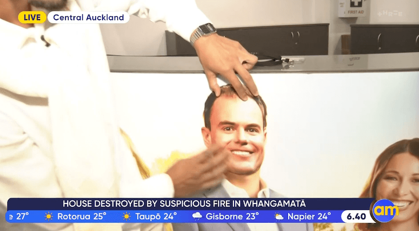 In classic first week back fashion, there were some loose ends from last year that still needed tidying up. Namely, the fact that Ryan Bridge is still on all the posters and graphics for AM. William Waiirua tacked on a Lloyd Burr mask over the old AM billboard at Three’s reception desk, and later the graphics team jankily added Burr’s head onto Bridge’s body in a promotional plug for the ThreeNow app. Jankiness? Around the ThreeNow app? Well I never.