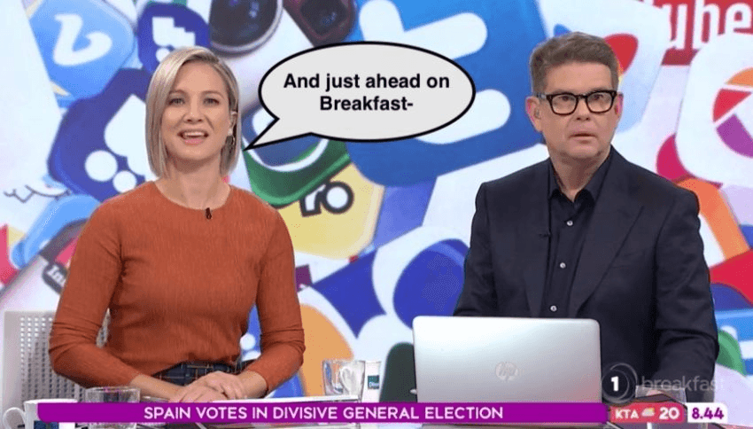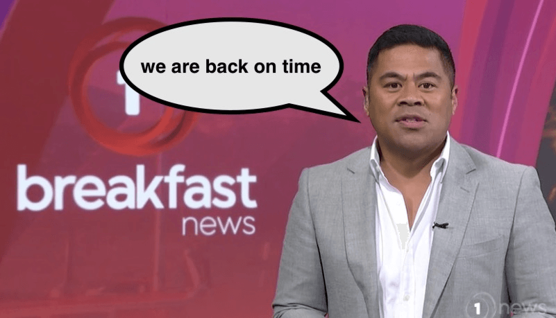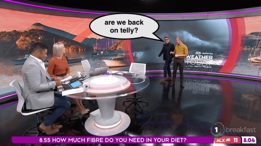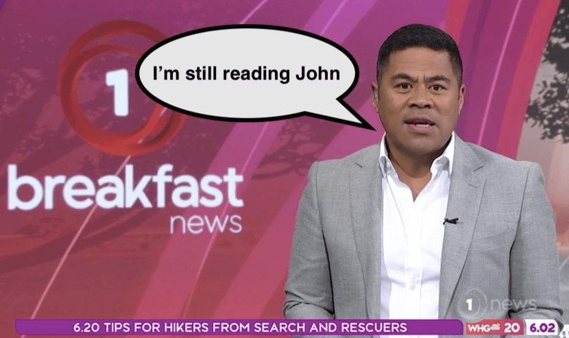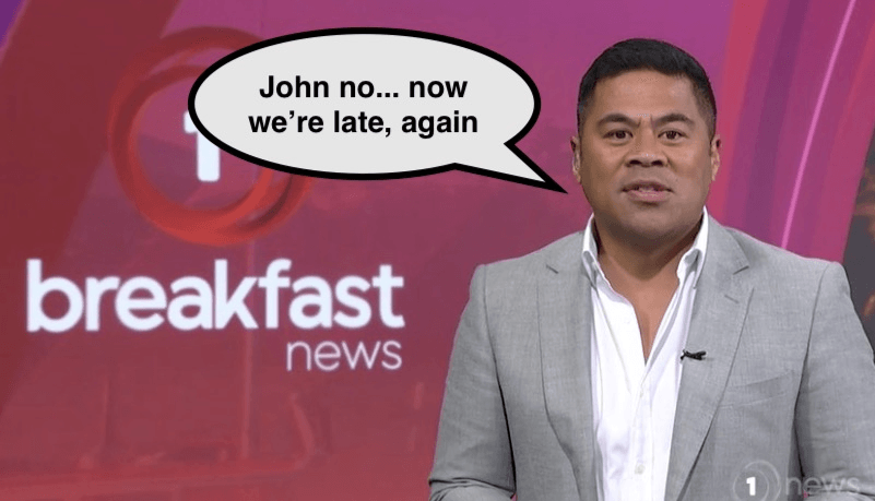 John attempted to explain his absence – a quest for the TVNZ nibble nook. “It’s called Breakfast and there isn’t any!” John explained. “Have you done the sport?”