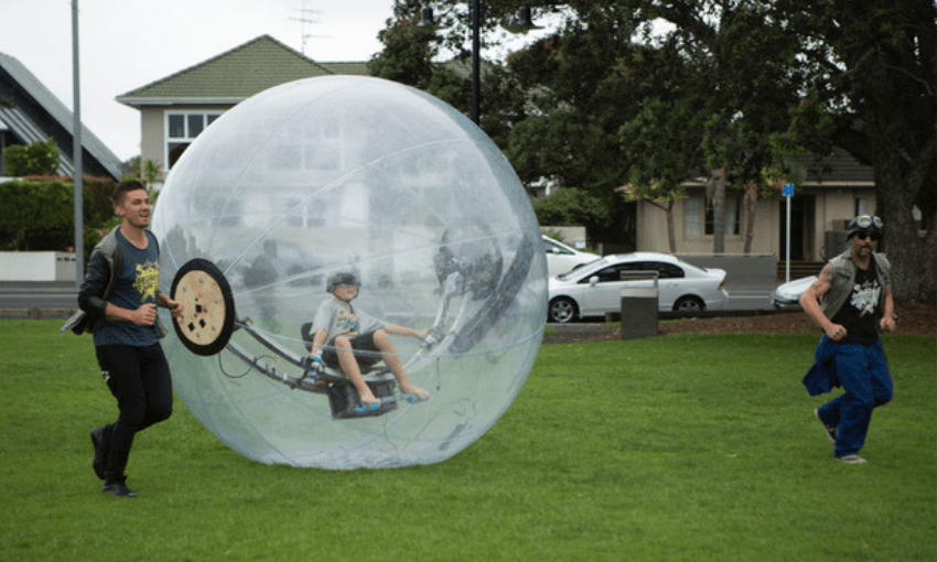 One particular invention that tested the limits of human existence was Human Skeet Shoot, which fired people six metres in the air so they could be pelted with rotten tomatoes. Was this dangerous? “We were very professional and didn’t harm anyone,” show creator Luke Nola told The Spinoff, before amending his statement: “Chris Stapp got a bit beat up.”