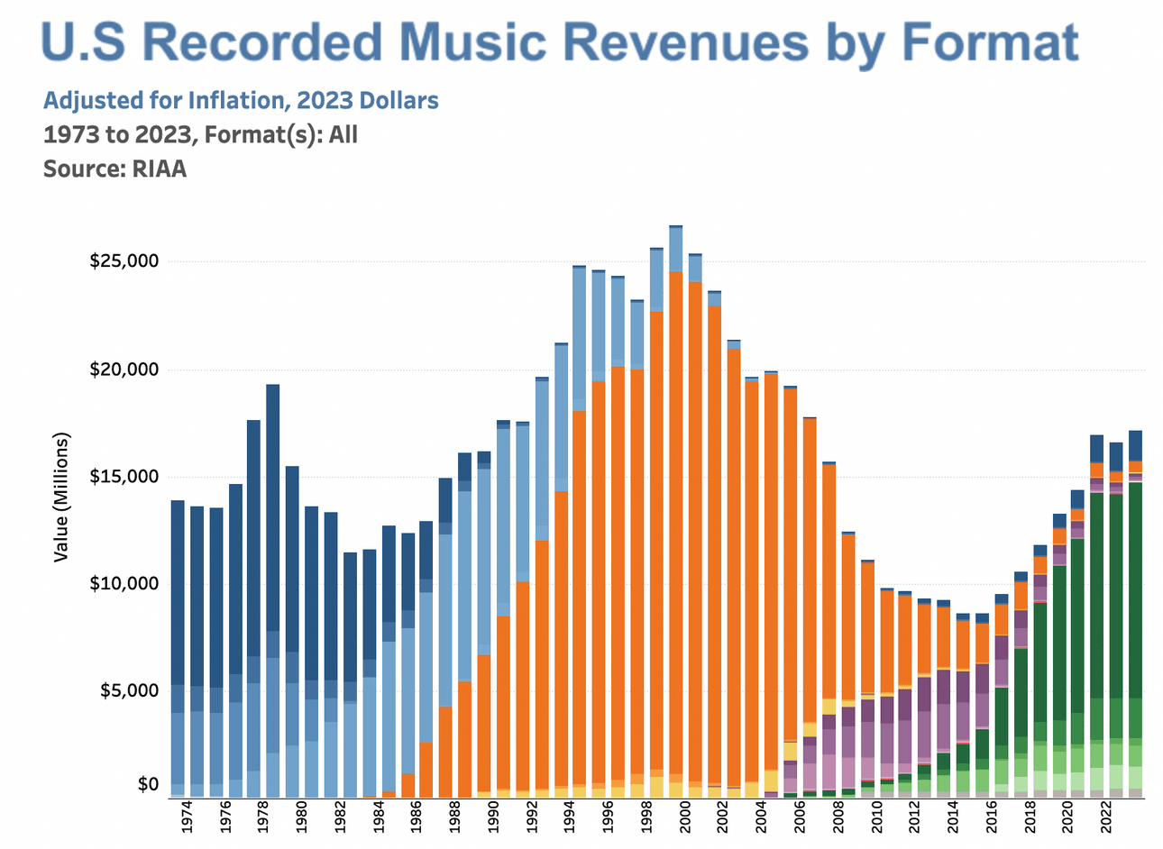 What you see here is three commodities. All remain hugely impactful in culture. But two have broadly retained or significantly expanded their economic foundations, while the third remains a shadow of its former financial scale. I’ll attempt to explain why, as I think it all ladders back in part to those two tech titans.