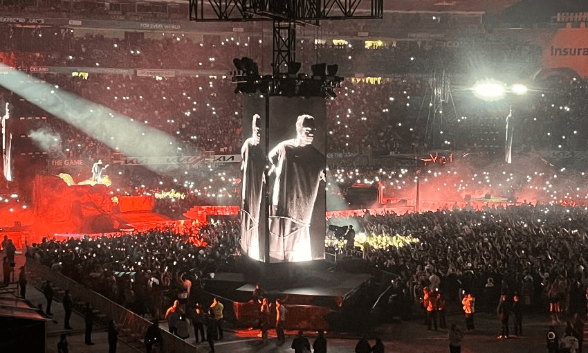 During his last song a crowd is gathering in GA trying to push through the barricade to get out of Eden Park, but it’s closed, and the security won’t budge. So, a man pushes his way through then tries to scrap out a security guard, gets shoved back in, and wastes his time in a shouting match. I kind of don’t blame them for being restless – I’m bored shitless after watching five soulless replays of ‘Fein’ as well.