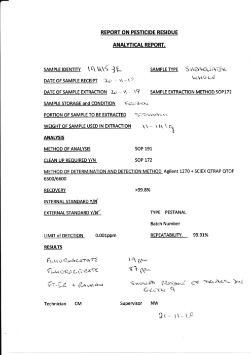 I explored it at length here, but a brief recap: F&F said an “independent laboratory” had found not just traces, but heavy concentrations, of 1080 in the animals. The results contradicted nil results found earlier that week by Landcare Research. F&F released a “lab report” but have refused to reveal where it came from. Since then, agencies, scientists and journalists have been trying to ascertain the identity of the “mystery lab”. Toxicologists, meanwhile, have expressed serious doubts over many of the report’s findings and methodology.