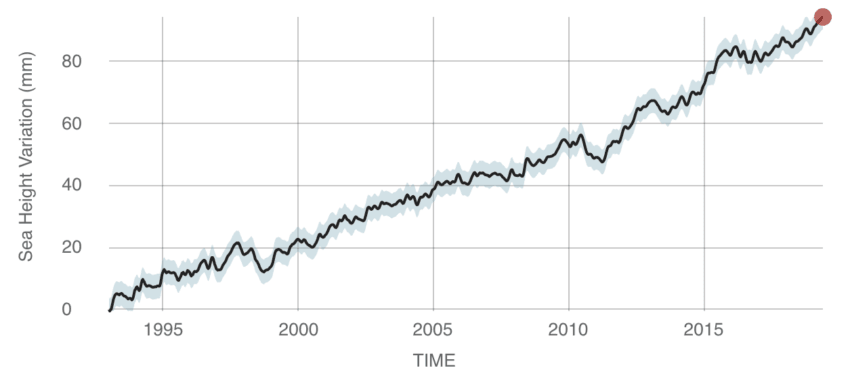 The warmer ocean, paired with melting ice sheets and glaciers, are contributing to an accelerated rate of sea level rise. While the global sea level rose by around 15 cm in the 20th century, it is now rising twice as fast, at 3.6 mm per year. And it’s getting faster.