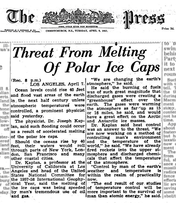 She joins the dots between one example from the Christchurch Press in 1957, headlined “Threat From Melting Of Polar Ice Caps”, and this week’s policy announcements in New Zealand. The Press report “warns of global warming leading to sea level rise”, said Priestley, “but it’s only now, in 2022 – when we can see and measure the effects of sea level rise, and make projections about what the next few decades will bring – that we’re really starting to take sea level rise seriously and start planning for it with measures outlined in the just published National Adaptation Plan.”
