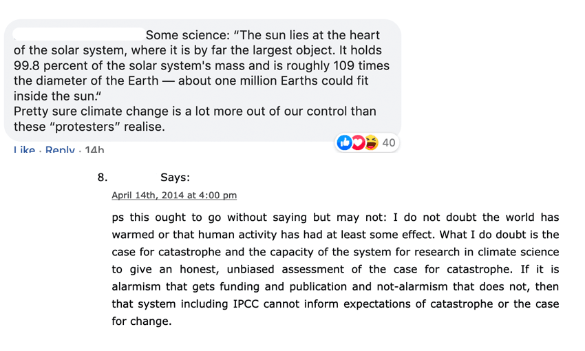 If you make the effort to respond that, for example, blaming the sun for climate change has been discredited, or that the studies they quote have been put together by the same researchers who argued cigarettes don’t cause cancer, they just move onto a new angle.