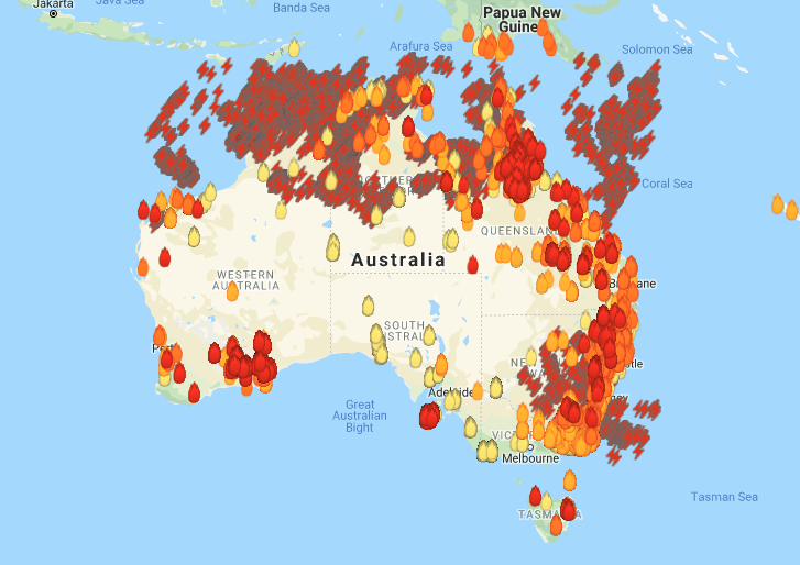 See an up-to-date chart of fires and lightning strikes in Australia here.
