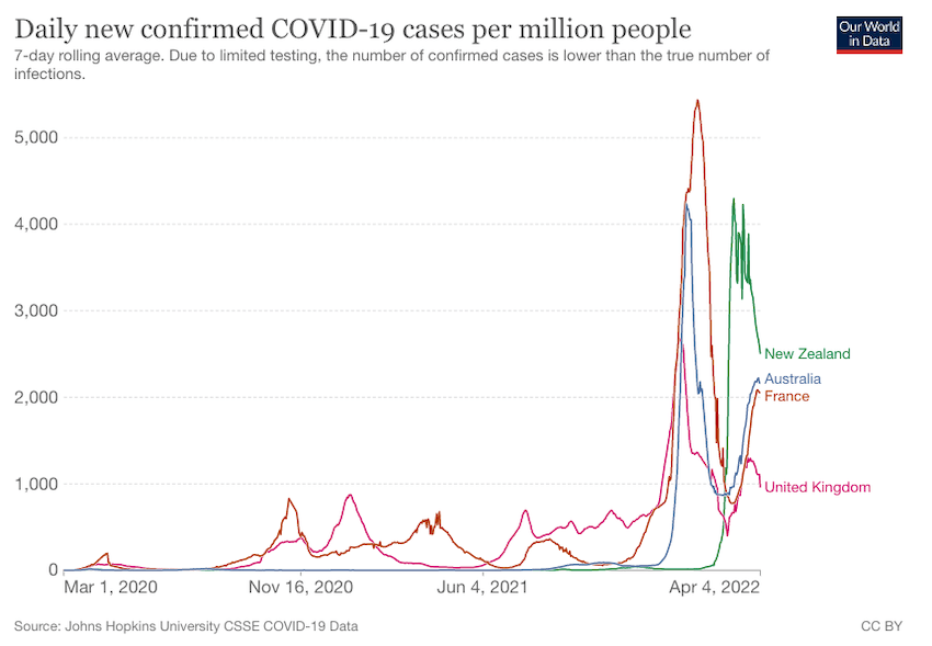 What worries us is that as more and more countries transition to the new Covid normal, the data is going to get more and more difficult to interpret. For example, on April Fool’s Day, the UK government ended free Covid testing for most people in England and removed the requirement for infected people to isolate. And no, it wasn’t a joke. Now if people want to know if they have Covid-19, they will have to pay for a test, even if they are symptomatic. Yes, there are some exceptions, but limiting access to testing is not only going to impact the course of the disease in England, it will also show up in the quality of the data recorded on sites like Our World in Data. See how France’s cases are currently increasing again while the UKs are now dropping? It’s no surprise that has coincided with the removal of free testing.