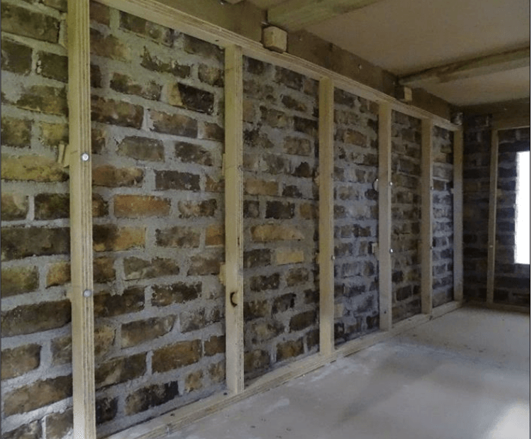 His solution is almost as simple as popping down to Bunnings for a load of timber strongbacks, then fastening them vertically along a brick wall at certain intervals, and to horizontal beams connected to the floor and ceiling.