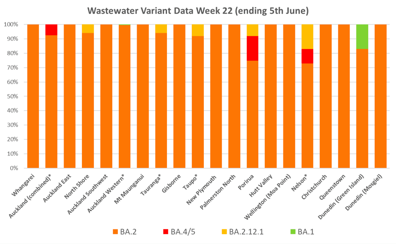 But each week, ESR is extracting wastewater RNA from around 20 sentinel sites and sending it to a company called Wilderlab which specialises in sequencing trace bits of genetic material from water. Below is a snapshot of some recent data. It shows that the majority of cases across the country are the BA.2 omicron variant – that’s the sea of orange – though some BA.1 is still being detected in Dunedin, shown in green. But it also shows that the new variants, BA.4 and BA.5 in red, and BA.2.12.1 in yellow, are now being detected. These are the omicron variants that are currently driving new waves of the pandemic overseas. It’s highly probable we will see these new variants, particularly BA.4/5, overtake BA.2 in the coming weeks. In combination with sequencing swabs from people in hospital, wastewater monitoring will help us to keep a close watch on how these new variants are adapting and spreading across Aotearoa.