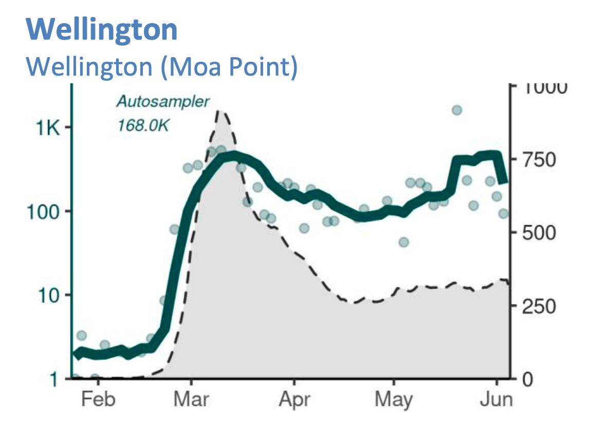 Each week, ESR produces a wastewater report. It’s full of graphs showing the wastewater detections for different areas of the country. Below is the graph for Moa Point in Wellington, a catchment with ~168,000 people. The grey shaded area is the rolling seven-day average of cases in the wastewater catchment, plotted on the right-hand axis. The thick greeny-blue line is the rolling 14-day trend of Covid viral RNA in the wastewater, plotted on a log scale on the left axis. The wastewater levels are the number of viral copies per person, per day – a sum that takes into account how much “flow” goes through a given wastewater plant and the number of people that contribute.