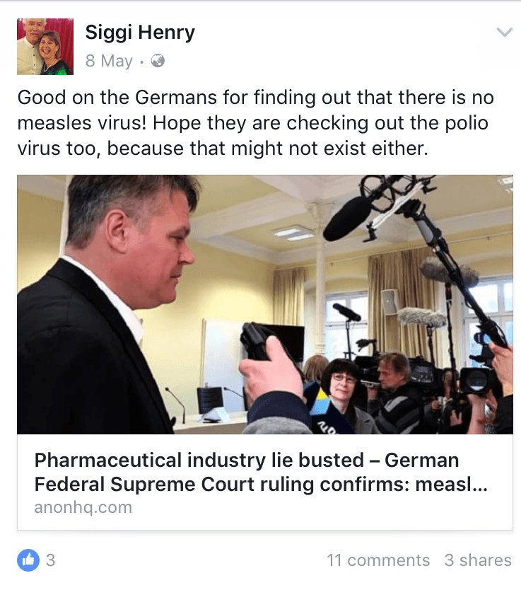 “Good on the Germans for finding out there is no measles virus! Hope they are checking out the polio virus too, because that might not exist either.”