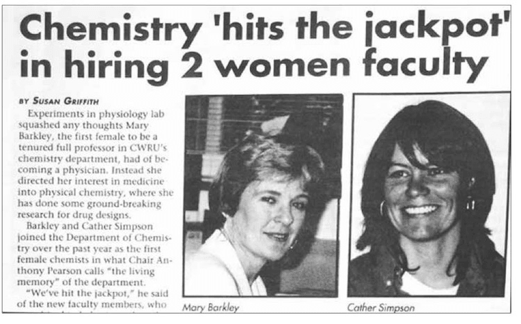 I was not surprised to find myself the first female assistant professor of chemistry when I arrived at CWRU; I knew the history going in. However, I was surprised that being female in a science career was still noteworthy in 1998. And I was very unprepared for how much being a woman actually mattered. In 2000, Prof. Nancy Hopkins from MIT spoke at CWRU. The previous year, she had published a study that demonstrated previously unrecognised gender inequivalence at MIT, and is now largely credited with revitalising efforts to level the playing field for women in academia in the United States. Sitting in the audience, I was powerfully struck by her observation that it had taken a lot of data for her to really believe that her career had been adversely affected by her sex. That was true for me as well, and I was only beginning to recognise it in my third year as an assistant professor.