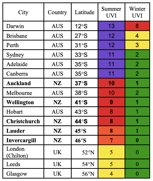 That’s right: the most significant reason New Zealand and Australia have the world’s highest skin cancer rates is due to colonialism and immigration. The overwhelming majority of skin cancers in New Zealand are found in Pākehā with skin types evolved to suit lower UV levels. As well as having naturally lower UV levels, the UK is also at a far higher latitude than many people realise, and consequently the peak UV levels are about half that found in New Zealand. British and northern European skin types just aren’t evolved to cope with the UV levels here.