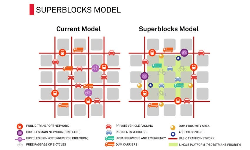 A superblock groups together multiple smaller city blocks, often a 3×3 grid. On the streets inside the superblock, through-traffic is restricted. Cars can still enter – but they’re speed-limited and must yield to pedestrians. “It’s stupid to go in if your destination is not inside,” Rueda explains. This opens up the street space for other things – people walking and cycling, al fresco dining, and more greenery.