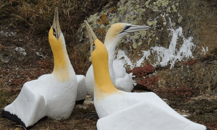 If you walk across the island and travel down a small path to its western cliffs, you’ll find a clearing filled with lifeless stone gannets. The site seems harsh and inhospitable, devoid of life. But five years ago, it became the setting for one of New Zealand’s greatest love stories when the fake birds were joined by one live gannet.