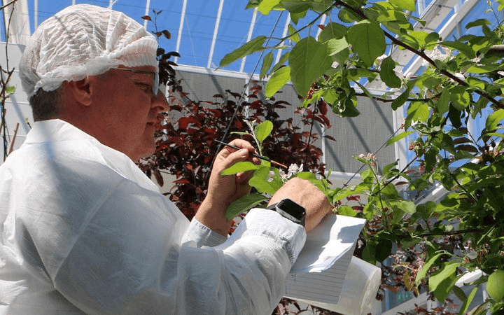At a Plant and Food Research greenhouse in Auckland, one of the sections is filled with $300 apple trees, and Andy Allan, a professor of plant biology, is pointing out one of his favourite experiment, a tree with bright, fuchsia-coloured flowers.