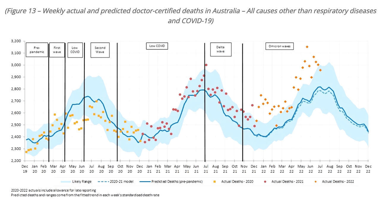 There is also growing evidence of people being at increased risk of things like strokes and heart attacks in the weeks and months after catching Covid. Might boosters reduce the risk? Some quite alarming data was recently posted online by the Actuaries Institute’s Covid-19 Mortality Working Group. They’ve analysed Australia latest provisional mortality statistics and calculated excess deaths from a variety of causes. While Covid is currently the third leading cause of death in Australia, deaths from causes other than Covid and respiratory infections are also up. Might these be evidence of the delayed impact of one or more Covid infections?