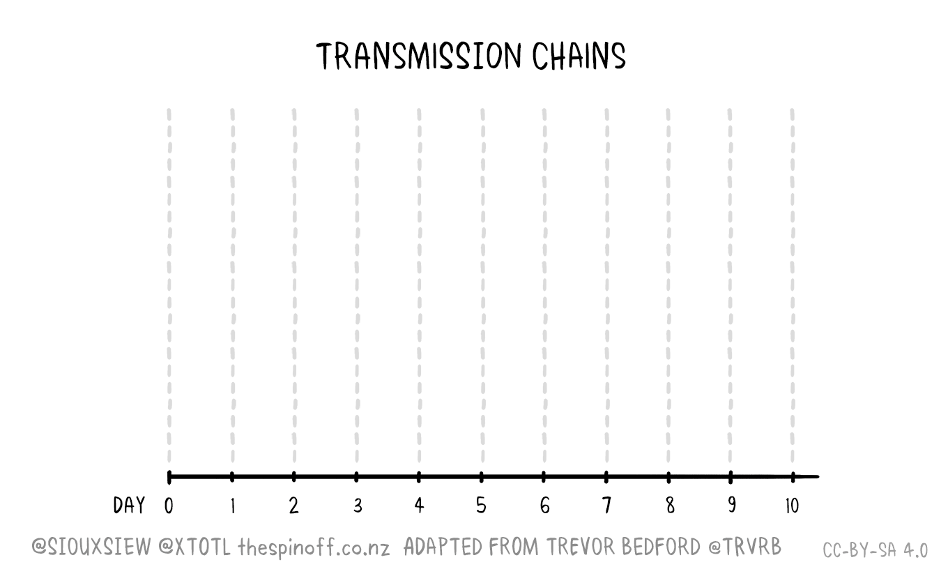 Another phrase we’re hearing a lot of at the moment is community transmission. Think of New Zealand as currently being divided into two camps. There are all the people who work at or closely interact with people at the border or in managed isolation and quarantine facilities. We’ll call them the border camp. Then there’s everyone else. We’re the wider community. Any case that starts in the community and can’t be linked to the border is called a case of community transmission.