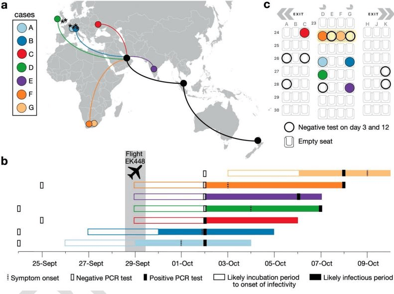 If they had been infected in their countries of origin, then we would expect them to be carrying very different viruses, genetically speaking. They weren’t. The genomes of the viruses from the seven cases were identical, except for a single mutation in one case. That’s pretty clear evidence that one of the passengers must have been the source. Comparing the seven genomes with a database of more than 155,000 sequenced globally came up with a match to just six others. Four of the six were from Switzerland, the country of origin of two of the passengers who tested positive – referred to in the study as A and B. They were travelling together as part of a family group and tested negative roughly three days before they boarded the flight in Dubai. One of those passengers (A) was the first to report experiencing symptoms, suggesting they were the one who was infectious during the flight. All the other passengers who became infected were seated within two rows of passengers A and B. The good news is that eight other passengers who also sat near passenger A didn’t become infected.