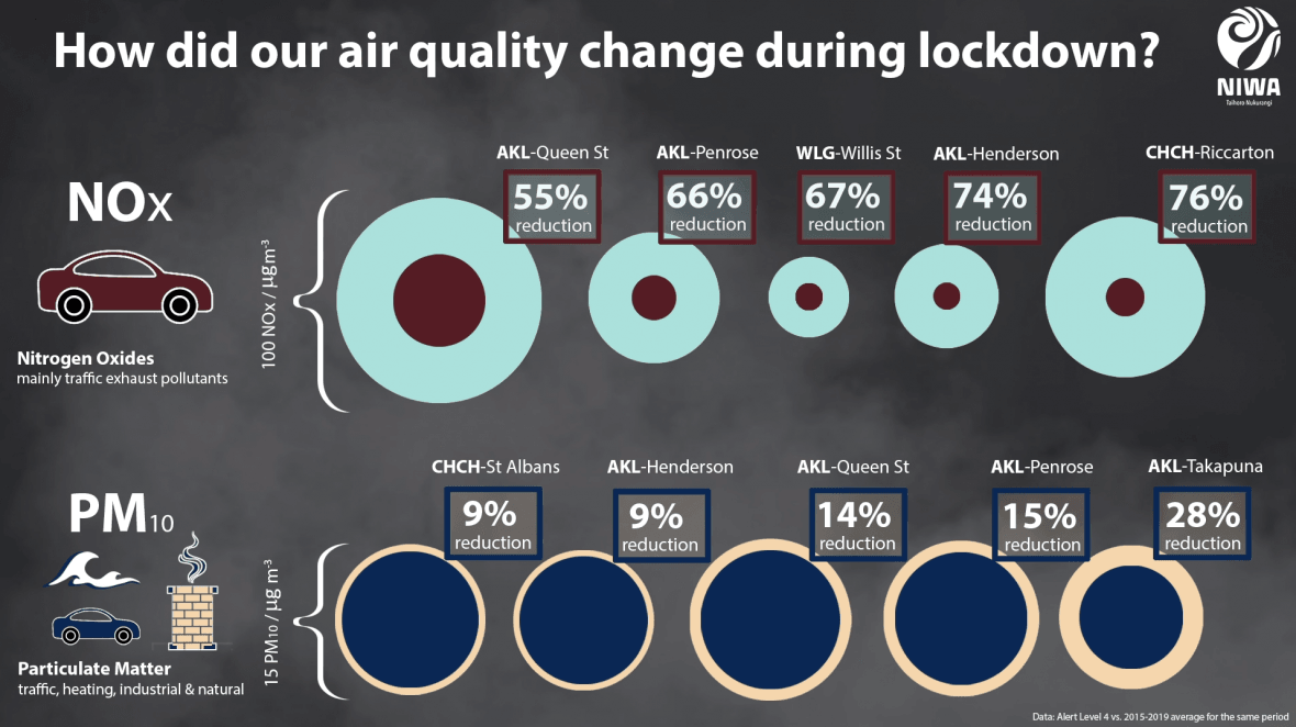 The results from Asia are important, but New Zealand’s location and geography are different in important ways. Dr Ian Longley is NIWA’s principal air quality scientist, and reported on changes in air quality through the lockdown period. “Lockdown has provided vivid confirmation of how in New Zealand cities, isolated from each other and international neighbours, and where heavy industry is largely absent, many pollutants can be made to almost disappear overnight,” he said. Longley studied road traffic pollution in Auckland, Wellington, and Christchurch, and showed that pollution was 5-35% of normal in level four, and between 47 and 63% of normal in level three.