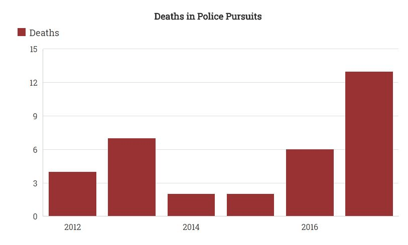 From April 2004 to May 2007, 12 people died in police pursuits. A decade later, in the period of April 2014 to May 2017, 13 people died in police pursuits.
