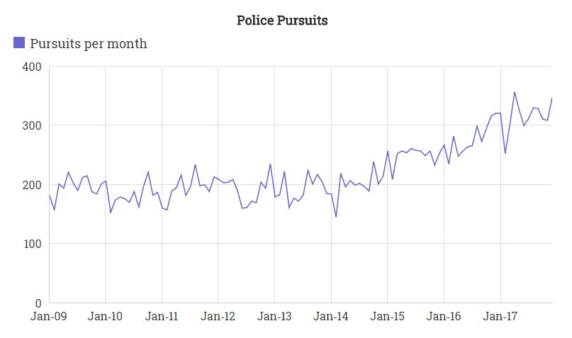 Here is how the number of police pursuits per month has varied from 2009 to the end of 2017: