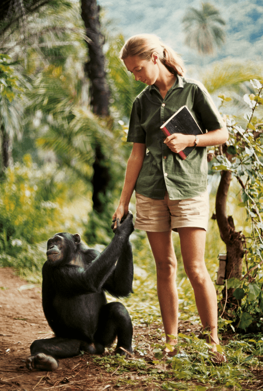 Dr Jane Goodall was the first person to prove that chimpanzees, our nearest kin, were nearer and dearer than we had ever been prepared to admit. She spent years of her life living among them in Gombe, Tanzania where she discovered that chimpanzees used tools and had unique personalities and behaviour. The discovery of tool-use by chimps turned our view of humans as somehow separate from other apes on its axis. Her supervisor, palaeontologist Louis Leakey, wrote at the time: “We must now redefine man, redefine tools, or accept chimpanzees as human!”