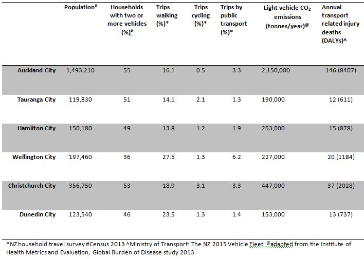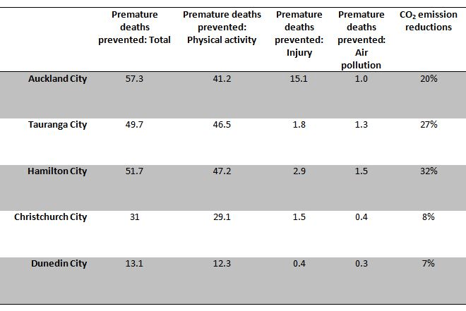 What sometimes tends to get overlooked is the cumulative effect of these decisions about transport planning and services (and how our cities are designed) on our health. We recently undertook some research estimating the effects of differences in transport systems between NZ cities on the health of citizens, and on the levels of greenhouse gas emissions. We wanted to know what would be the benefits for residents of Tauranga, Auckland, Hamilton, Christchurch and Dunedin if these cities had the same use of sustainable transport as Wellington city (where around 35% of trips are taken by walking, cycling or public transport).