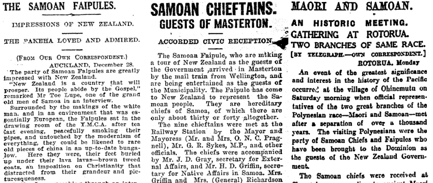 A photo in the Auckland Weekly News of the delegation of faipule shows an assembly of distinguished men under the caption “Wise men of Sāmoa who are on a visit to New Zealand to learn the white man’s ways”.