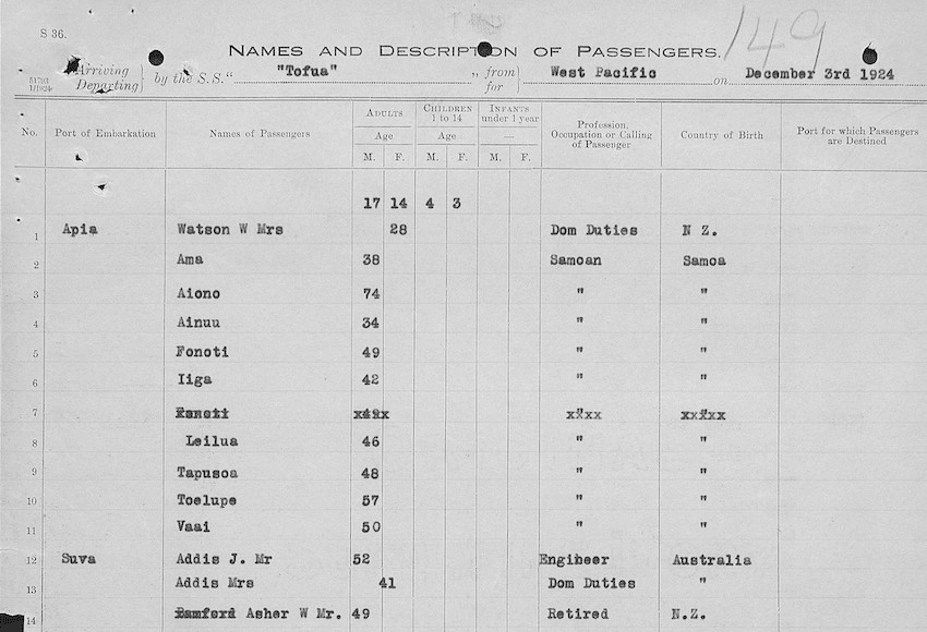 Faipule spokesman Toelupe – whose occupation in the ship Tofua’s passenger manifest is simply “Samoan” – told the Wellington reception that the love and sympathy of the people of New Zealand had touched them deeply. They wished the British flag would continue to fly over Sāmoa because it represented freedom, justice and truth. He said they were grateful to have in General Richardson an administrator who so quickly understood them and wished that his time be prolonged, as he was putting right many of the things that had hindered Sāmoa in the past.