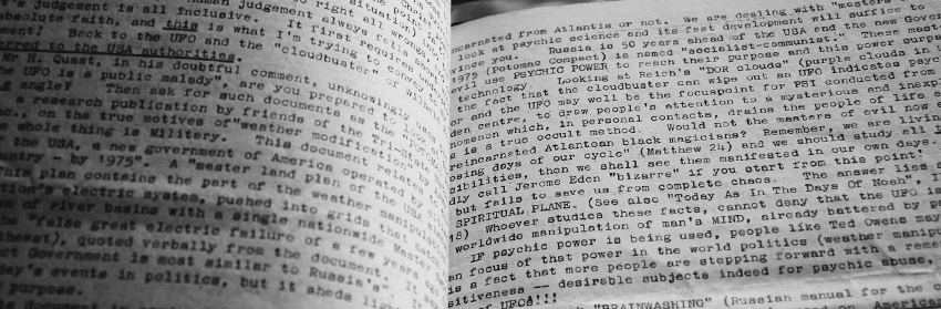 Bartholomew asks if I want to see some of his other books. Down the corridor, there’s a room full of books, magazines, and ring binders stuffed with photocopies. He pushes the door open as far as it will go, which is about a third of the way, and slips inside. “I have to close this to move around, sorry,” he says, and I stand in the hallway being passed binders through a crack in the door: Psychic Australian, the Roswell Report, Skeptic Magazine, and – of course – the Fortean Times.