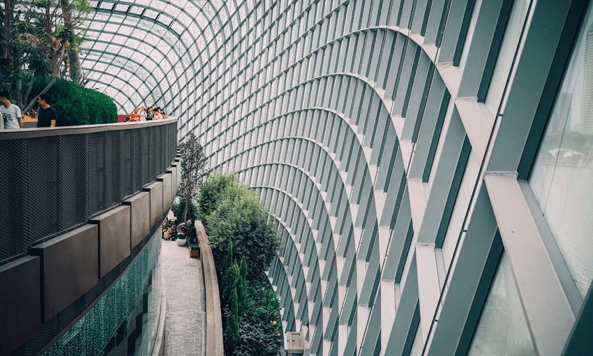 I use up all my remaining phone data finding my way back to the hotel, where the concierge takes pity on me and lets me into my room early. The windows are huge, and the view out to the tourism that ticks over like a clock or a bomb, is endless. There’s a ship in the sky, stranded on top of two towers, and I stare at it for ages, because I can’t make sense of what it’s doing there. Near it, I can see the famous gardens I’ve read about on the plane, in the travel magazine slicked with oil from other people’s fingers. That’s where I’ll go later, I think. Being among plants and flowers will be the antidote to this sense of disembodiment. Every now and then I jump out of my skin, as I feel an elevator come to a stop halfway down my shins, like it’s stuck between floors. I have a ghost lift going up and down inside me. I am disoriented, more than slightly sad, and even worse, I have jet lag.