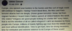Casson, however, had saved his most horrid thoughts for a post back in 2016 in which he called Muslim refugees “scum” who were “invading” Europe. His current employer, Immigration NZ, has said that it doesn’t support the 2016 comments made by Casson but that it couldn’t further comment, calling it an “employment matter”. Casson is running for re-election in October and has also thrown his hat into the ring for mayor.