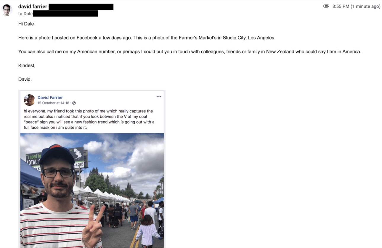I didn’t have a scanner (and was unsure what I would scan) so replied with a recent screengrab, where I’d posted a photo of me in America.