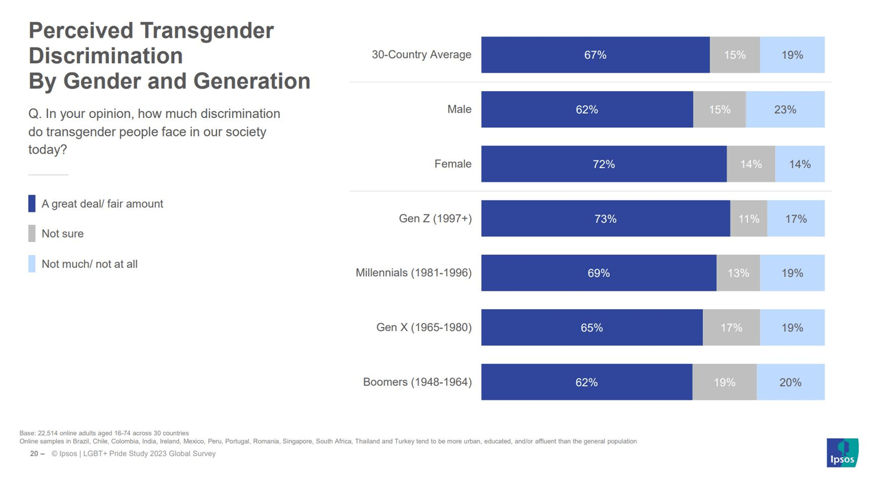 There were a number of questions asked within the survey relating to transgender discrimination, gender-affirming care, access to single sex facilities according to gender identity, official documents and gender transition healthcare. Globally, boomers were most supportive of protection against discrimination (specifically around employment and housing) but least supportive of health insurance systems covering gender transition costs and transgender people being allowed to use single-sex facilities that correspond with their gender identity. With the exception of health insurance subsidies, there was a global majority in favour of trans people accessing gender-affirming care, public facilities and having official documents offer more options than male and female for those who don’t identify as either.
