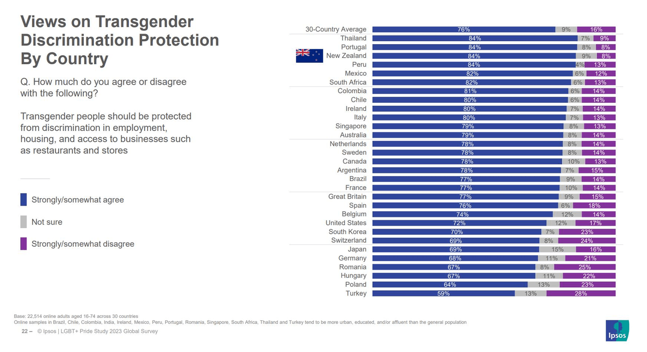 The latest global survey from Ipsos – the LGBT+ Pride 2023 survey – shows that 84% of New Zealanders believe transgender people should be protected from discrimination in employment, housing and access to businesses. The report, released today, comes after the March visit from anti-trans campaigner Kellie-Jay Keen-Minshull (Posie Parker) sparked fiery debate and protest around transgender rights in Aotearoa. Of the 30 countries surveyed, New Zealand scored highest on its views on discrimination protection, and globally, all generations (Gen Z, Millenial, Gen X, Boomer) scored equally. Put another way, New Zealand scored the lowest (8%) for those who believed transgender people should not be protected from discrimination.