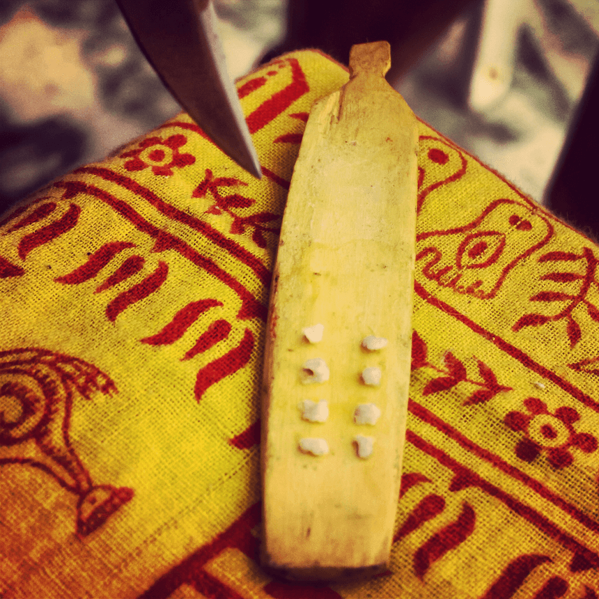To my left sits a lean, pale, bald man in a deep state of meditation. His spine is so straight and well aligned that it forces me to check my posture. A vast collection of small pale dots decorate his upper arms – kambo scars – he’d definitely done this before. He tugs in a deep breath and rouses from his contemplation, adjusting the red banana tied around his head. He looks like Rambo. Kambo-Rambo.
