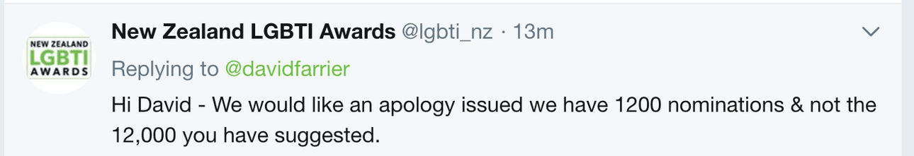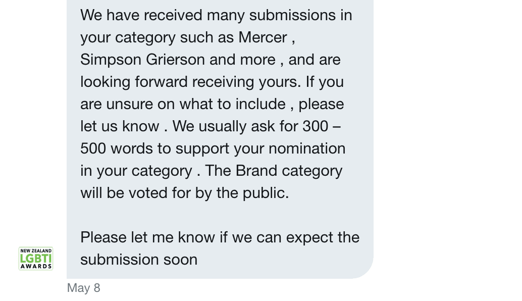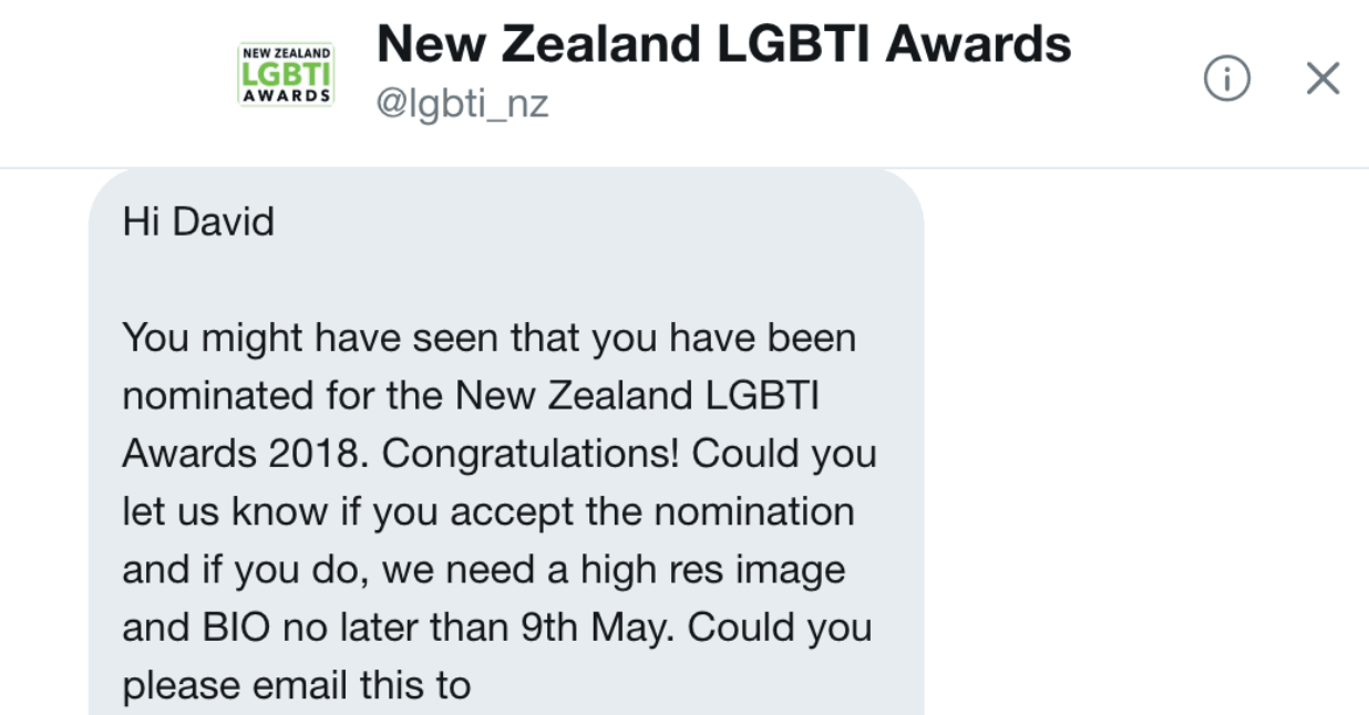On April 30, I was nominated for an LGBTI award. I learned this via a tweet from The New Zealand LGBTI Awards’ Twitter account, which described the awards as “Rewarding those who make a real difference to the lives of LGBTI people across New Zealand.”